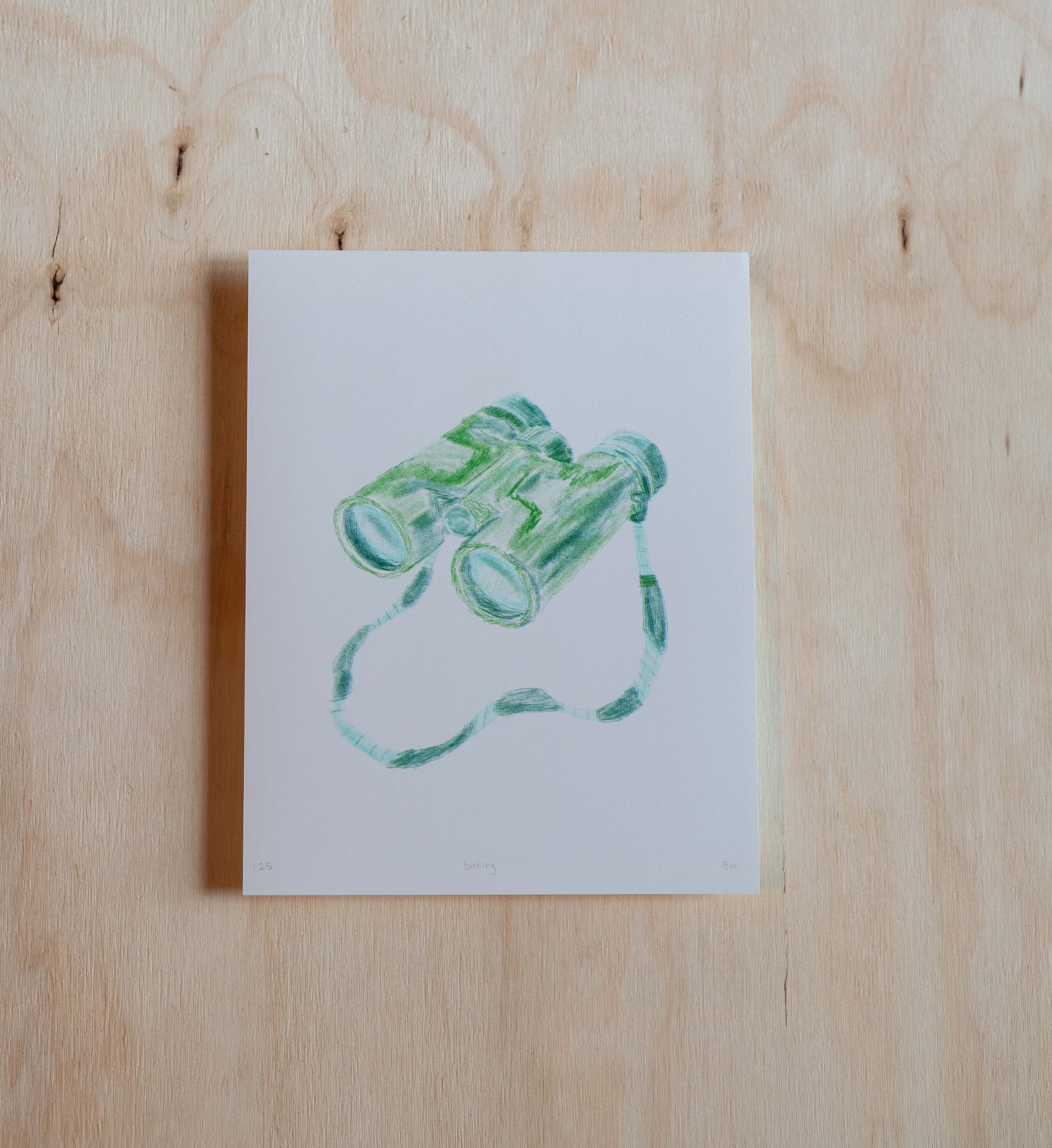 A three color risograph print that reminds us to grab our binoculars on our way out the door to the park.