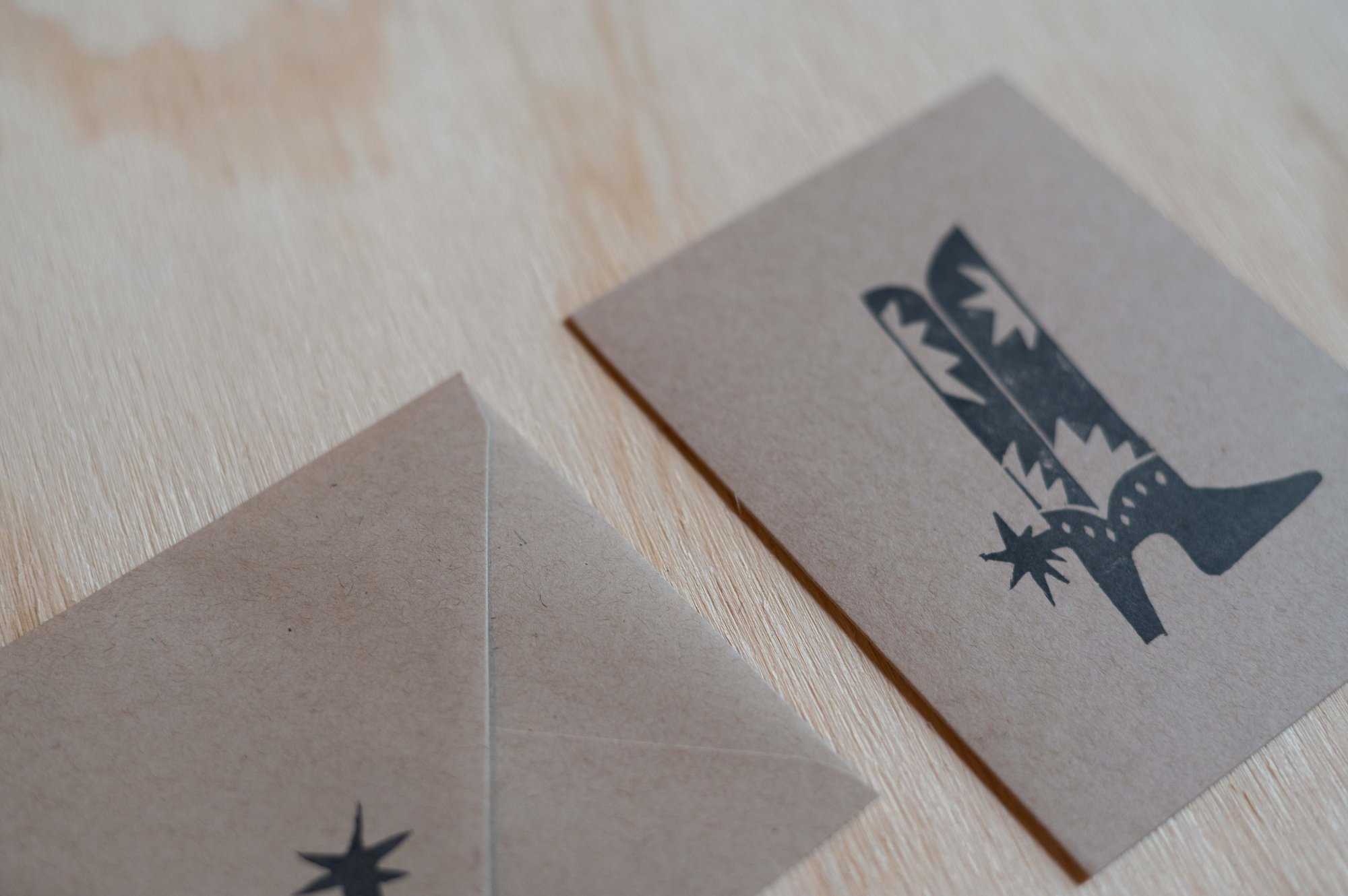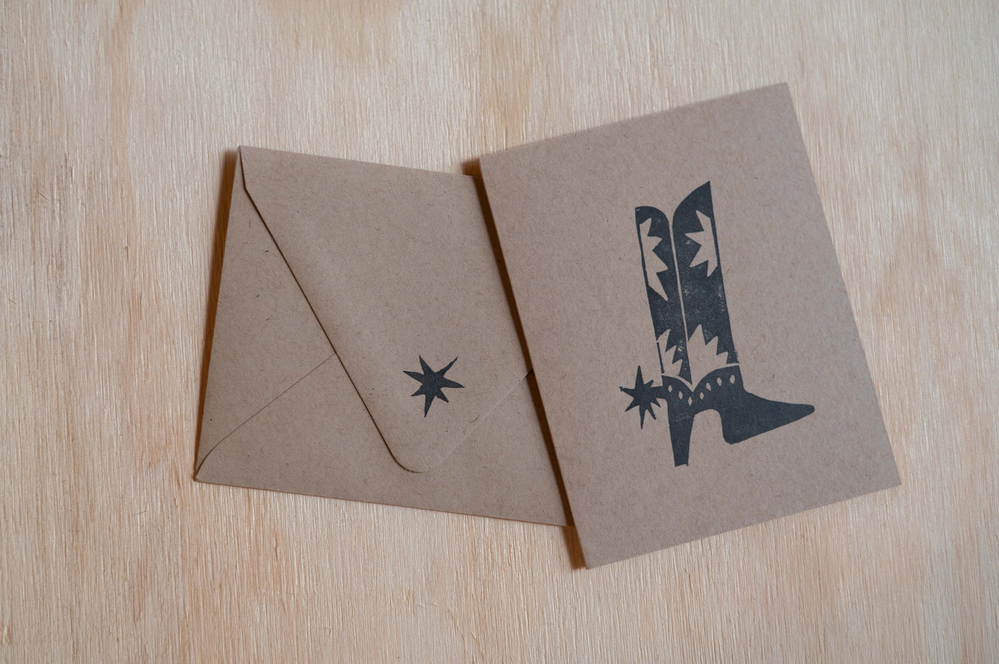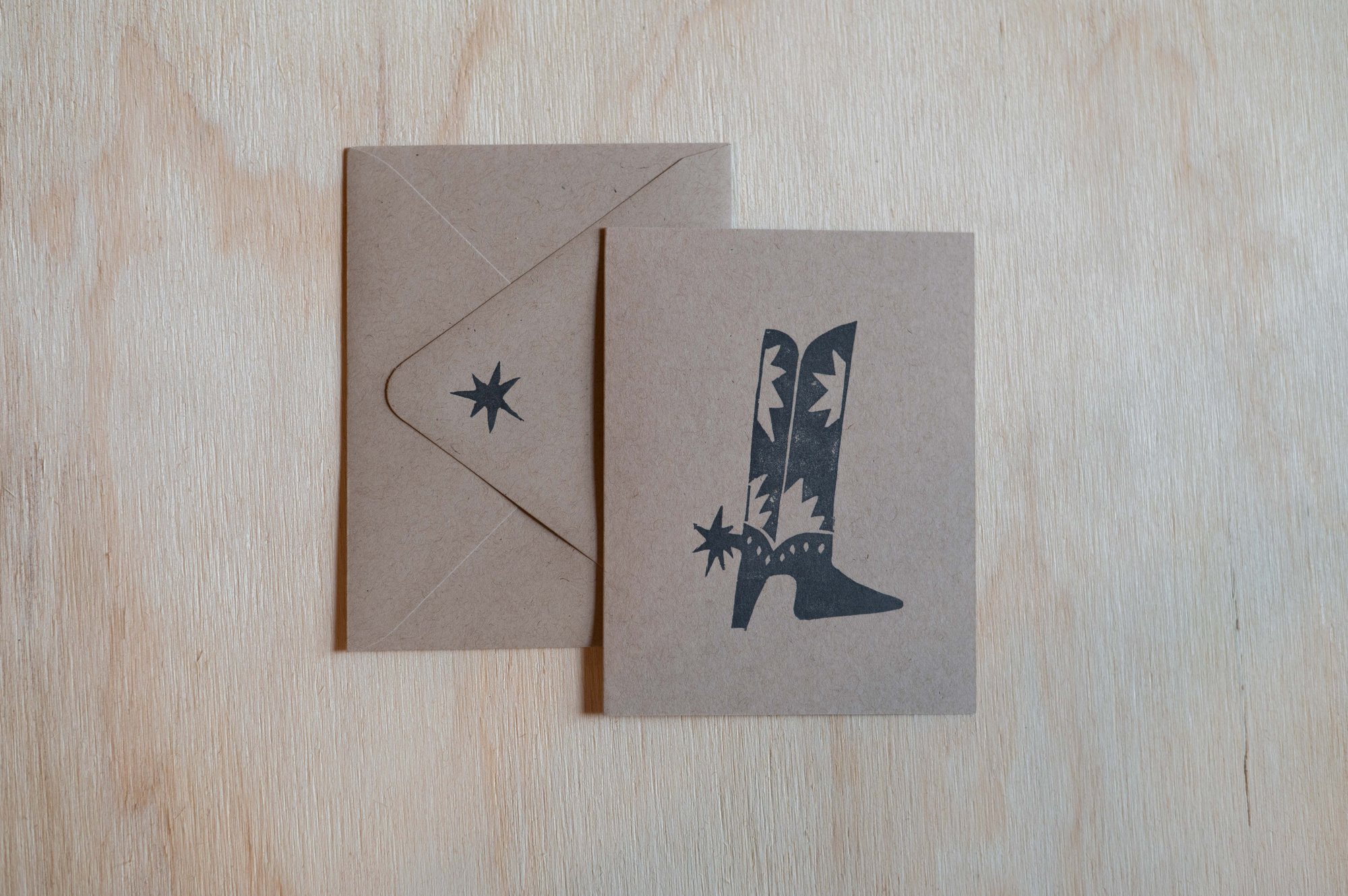 Yeehaw cowgirl! Nothing says "Wild West" like a handwritten note in a hand printed card. This card is blank inside, and includes a stamped craft paper envelope.