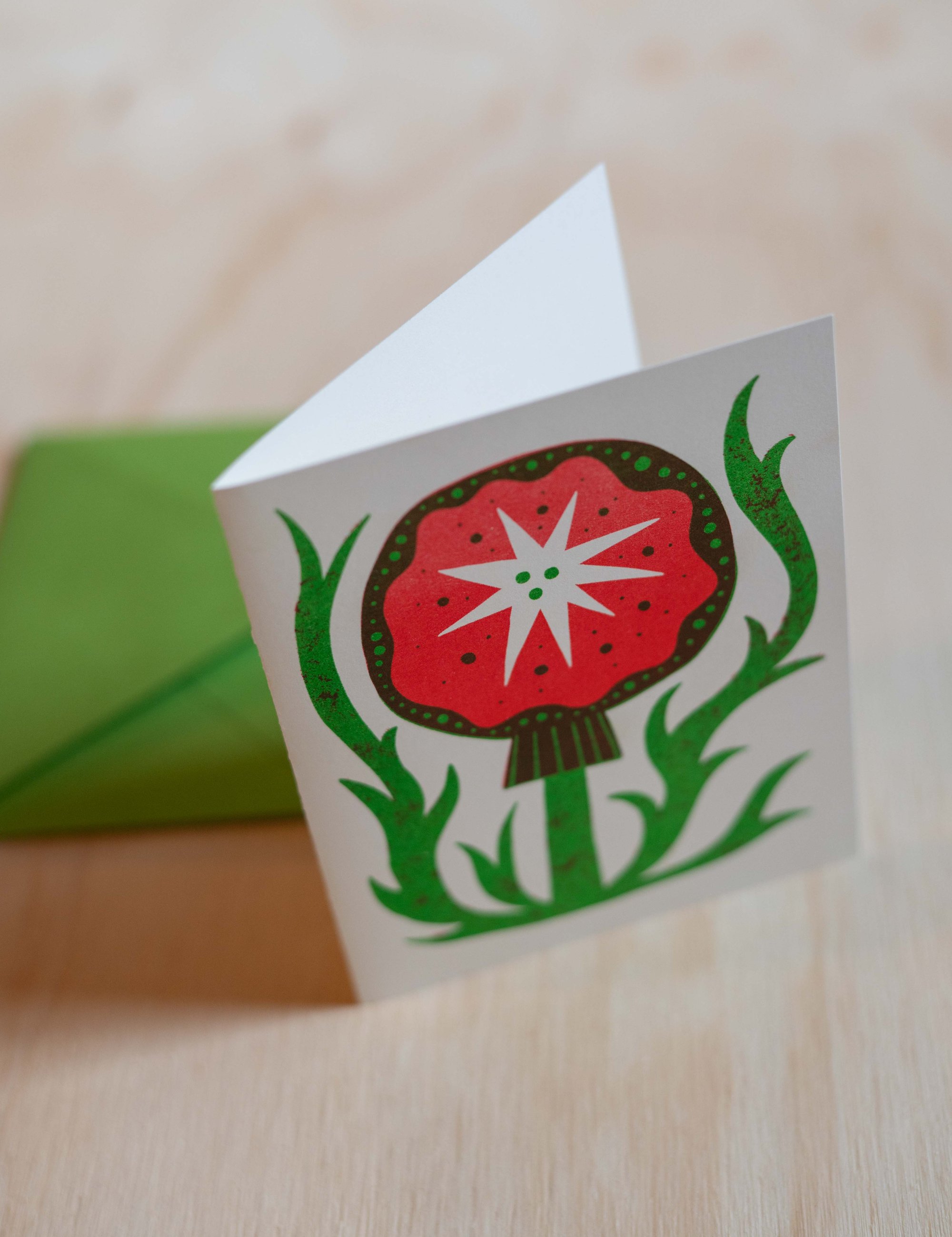 This funky floral card is empty inside so you can fill it with your wonderful handwritten notes. Purchase individually, or mix and match with the other green and red cards in this series!