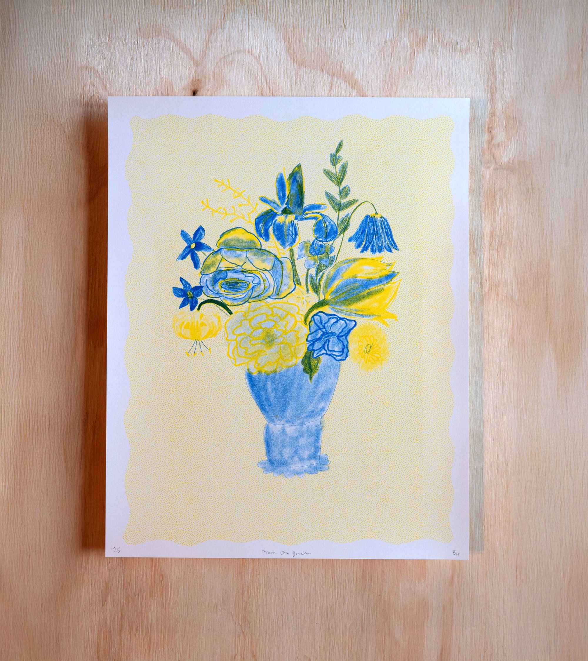 A vase of flowers from the garden, but these will stay bright all year round! This two color risograph print utilizes a technique called overprinting, where inks (yellow and blue) overlap to create a new one (green).