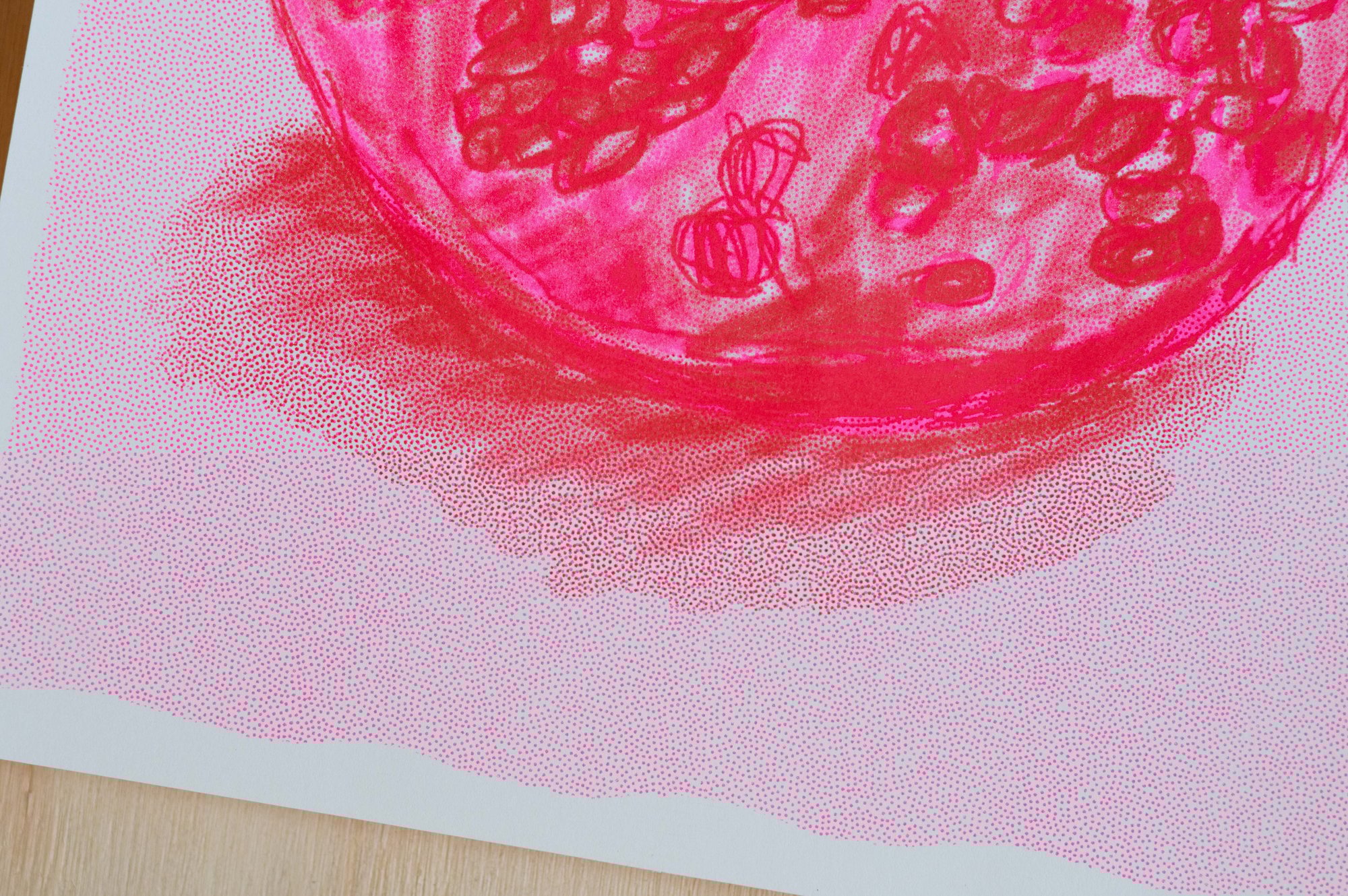 A bright and flashy take on the pomegranate, a traditionally darker winter fruit. This is a two color print, utilizing pink and red inks.