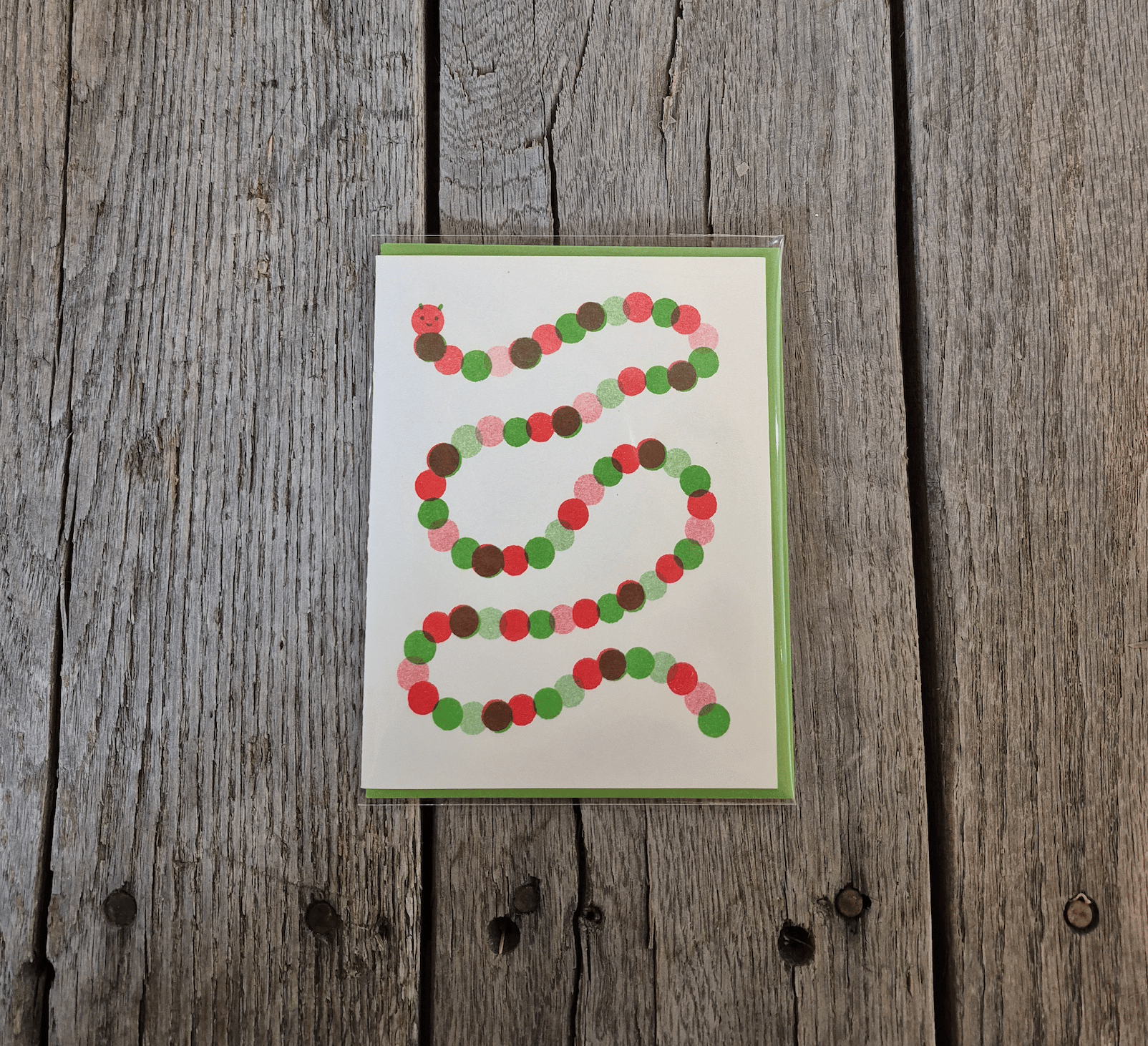 This windy-wormy greeting card is empty inside, ready to be filled with your handwritten notes. Purchase individually, or mix and match with the other green and red cards in this series!